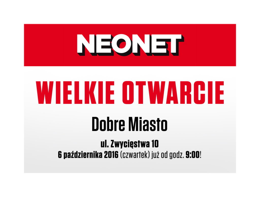 Bony zakupowe dla pierwszych 60 osób, konkurs z atrakcyjnymi nagrodami, promocje i obniżki cen na cały asortyment – to wszystko czeka na klientów, którzy 6 października (w czwartek) przybędą na Wielkie Otwarcie NEONET w Dobrym Mieście przy ulicy Zwycięstwa 10! Największe zalety nowego salonu, to lokalizacja w centrum oraz bliskie sąsiedztwo innych sklepów, a także poczty, apteki i urzędu.
