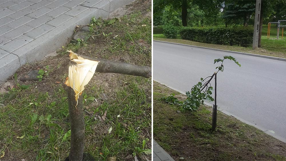Kolejny akt wandalizmu w Dobrym Mieście. Znowu połamali drzewka przy ul. Zwycięstwa. Ktoś zdecydowanie nie lubi drzew w Dobrym Mieście. Dopiero co Urząd Miasta posadził na nowo drzewka w miejsce połamanych poprzednim razem, a już wandale zdążyli połamać prawie wszystkie drzewka wzdłuż ulicy Zwycięstwa.