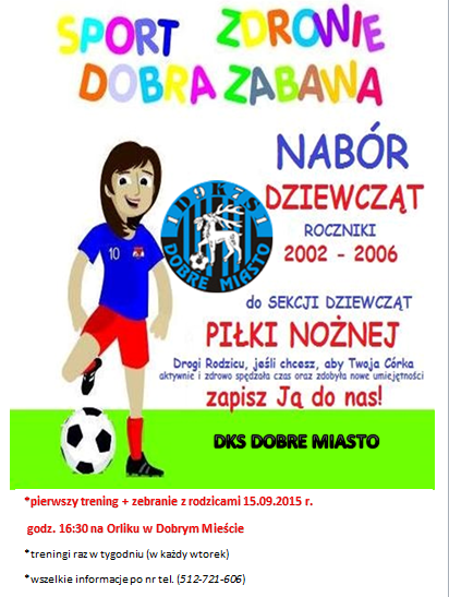DKS Dobre Miasto informuje także o utworzeniu sekcji dziewcząt rocznik 2002-2006. Zapisy odbędą się przed pierwszym treningiem, który odbędzie się 15 września (wtorek) o godzinie 16:30 na Orliku. Do końca października treningi dla dziewcząt odbywać się będą na dobromiejskim Orliku we wtorki lub w czwartki (raz w tygodniu). Natomiast od listopada do końca lutego – o stałej porze w czwartki o godzinie 16:30 w Sali Gimnastycznej przy ul. Ułańskiej. Zapraszamy wszystkich rodziców ze swoimi córkami, które chcą spędzić aktywnie i zdrowo czas z piłką!