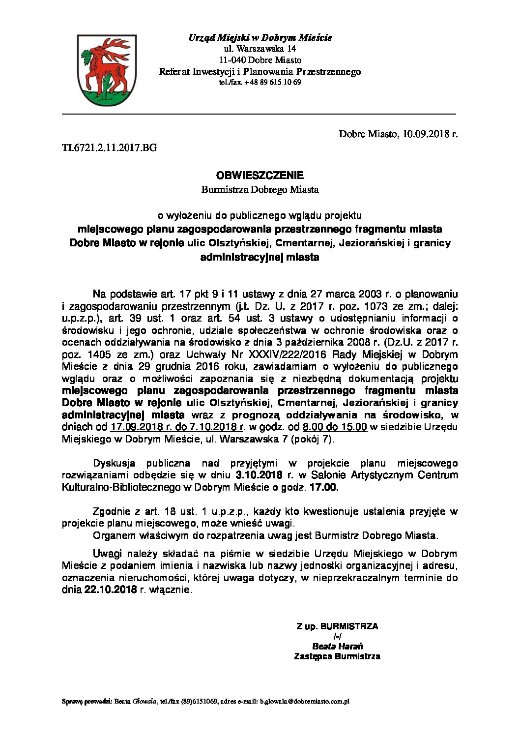 OBWIESZCZENIE Burmistrza Dobrego Miasta o wyłożeniu do publicznego wglądu projektu miejscowego planu zagospodarowania przestrzennego fragmentu miasta Dobre Miasto w rejonie ulic Olsztyńskiej, Cmentarnej, Jeziorańskiej i granicy administracyjnej miasta