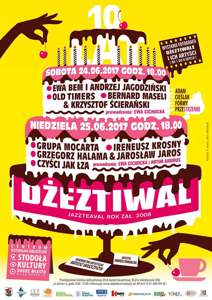 Jubileuszowa edycja festiwalu nawiązuje do największych tradycji polskiej sztuki muzycznej i kabaretowej. Kierownik artystyczny festiwalu Mateusz Iwaszczyszyn zadbał by dwudniowe spotkanie artystyczno-towarzyskie iskrzyło się pretekstami przeżyć estetycznych i rozmów intelektualnych. W scenerii Stodoły Kultury, z oryginalnymi smakami i zapachami herbaty, galerii sztuki, wystąpią wspaniali muzycy, wokaliści, aktorzy kreujący klimaty sztuki autorskiej wpisanej w historię kultury polskiej.24. sobota – Ewa Bem, Andrzej Jagodziński, Bernard Maseli, Krzysztof Ścierański, Old Timers, prowadzenie – Ewa Cichocka25.niedziela – Grupa MoCarta, Ireneusz Krosny, Grzegorz Halama, Jarosław Jaros, Czyści jak Łza, prowadzenie – Ewa Cichocka, Artur Andrus Hejnał festiwalowy tradycyjnie zagrają Mateusz Iwaszczyszyn i Krzysztof ZawistowskiGaleria – „10.Dżeztiwalu”- wystawa fotografii dokumentująca dziesięcioletnią historię Dżeztiwalu.Przedsprzedaż biletów: jednodniowy 20 zł, karnet dwudniowy 30 zł w sekretariacie CKB, ul. Górna 1a w godzinach 9:00 – 17:00