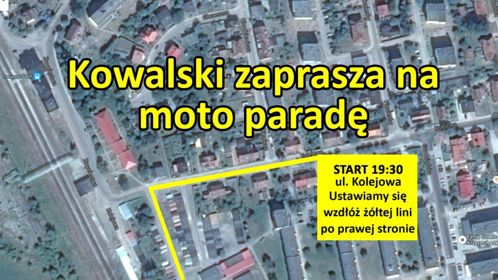 Już w czwartek 30 czerwca o godzinie 19:30 rozpoczynamy moto paradę przed meczem Polski z Portugalią. Start z pod Joker Pub ul. Kolejowa. Prosimy wszystkich zmotoryzowanych o ustawianie się wzdłuż żółtej linii (patrz mapka) od ulicy Kolejowej w kierunku torów między garażami. Ustawiamy się po prawej stronie nie blokując ulic Grudziądzkiej, Pionierów, Chodkiewicza.