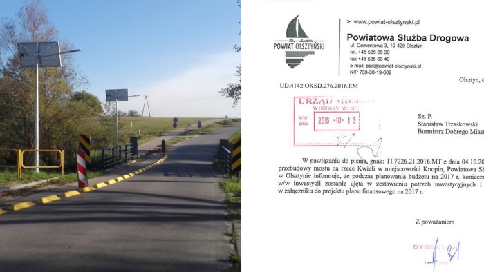 „Od pewnego czasu wraca jak bumerang (a raczej wyciągana jest jak trup z szafy) sprawa mostu na Kwieli. Przypominam, że ten most (jak i cała droga Dobre Miasto – Swobodna) jest mostem powiatowym. W celu poprawy bezpieczeństwa pieszych, Powiatowa Słuzba Drogowa wyznaczyła TYMCZASOWY pas ruchu dla pieszych za pomocą separatorów ruchu. Separatory te, tak w Polsce jak i na świecie, stosowane są m.in. do optycznego i mechanicznego wyznaczenia zawężonych pasów ruchu, wyznaczania krawędzi jezdni oraz do przeciwdziałania niepożądanemu (niekontrolowanemu) przejeżdżaniu na powierzchnie wyłączone z ruchu, ciągi piesze i rowerowe. Zastosowanie w tym miejscu takiego rozwiązania, jako czasowego, do czasu przebudowy mostu i wykonania chodnika, uważam za celowe, bo przecież poprawia bezpieczeństwo pieszych. Zamiast więc nieuzasadnionej, a często nawet głupiej krytyki, lepiej połączmy siły, by zapowiadana przebudowa mostu w 2017 roku doszła do skutku. Zwracam się o to zwłaszcza do naszych radnych powiatowych.” źródło: Stanisław Grzegorz Trzaskowski
